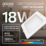 Светильник Gauss Basic Downlight квадрат 18W 1600lm 4000K 170-260V IP20 170*26 белый LED 1/60